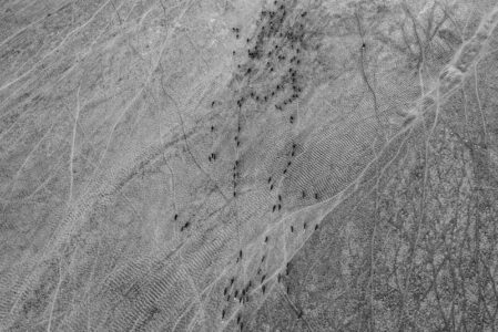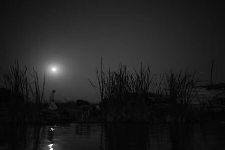 Al-Ameri’s photographs show the effects of these projects. Images of cracked earth, beached boats and parched expanses sharply contrast photographs taken earlier, showing buffaloes bathing in the waters and people rowing along the banks in their canoes.